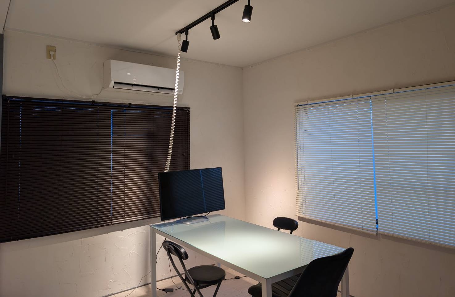 白を基調にしたミニマルなオフィスです。ブラインドで光を調整し、スポットライトとガラス天板のテーブルで資料も見やすく、常設モニターで図面や写真を共有しながら落ち着いてご相談いただけます。