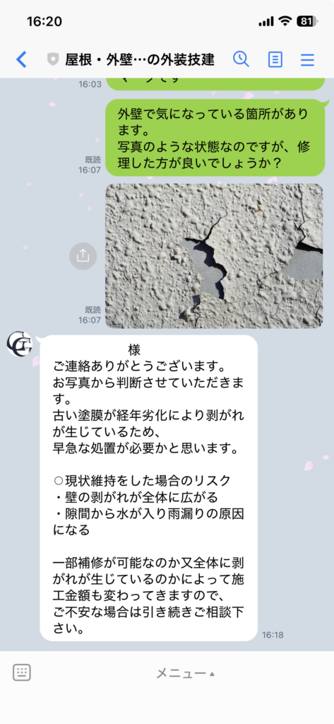 そうした声に対して、外装技建がご用意したのが、LINEでの写真相談です。